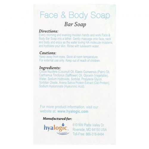 Описание товара Hyalogic LLC, кусковое мыло для лица и тела, с гиалуроновой кислотой, 113,4 г (4 унции)