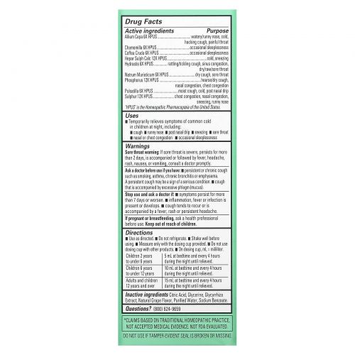 Ночной сироп от кашля и простуды для детей от Hyland's 4 Kids облегчает общие симптомы простуды у детей, в том числе кашель, чихание, боль в горле, насморк, заложенность носа, накопление секрета в бронхах, помогает при эпизодической бессоннице.
