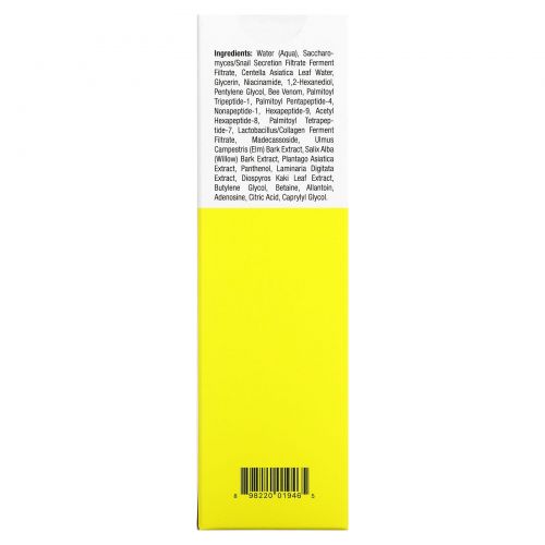 Вода (Aqua), Сахаромицеты / Фильтрат секреции улиток Фильтрат фермента, Центелла азиатская (Centella asiatica), глицерин, никотинамид, 1,2-гександиол, пентилен гликоль, Пчелиный яд, пальмитоил трипептид-1, пальмитоил пентапептид-4, Нонапептид-1, гексапептид-9, ацетил гексапептид-8, пальмитоил тетрапептид-7, Лактобактерии / фильтрат фермента коллагена, Мадекассосид, Экстракт коры вяза (Ulmus campestris), экстракт коры ивы (Salix alba), Экстракт подорожника азиатского, пантенол, Экстракт ламинарии пальчатой, Экстракт листьев диоспироса каки, бутиленгликоль, бетаин, аллантоин, аденозин, лимонная кислота, каприлилгликоль.