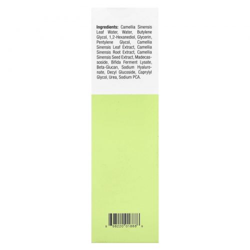 Вода из листьев зеленого чая (Camellia sinensis), Вода, бутиленгликоль, 1,2-гександиол, глицерин, пентилен гликоль, экстракт листьев зеленого чая (Camellia sinensis), экстракт корня зеленого чая (Camellia sinensis), экстракт семян зеленого чая (Camellia sinensis), Мадекассосид, лизат ферментов бифидобактерий, Бета-глюкан, Гиалуронат натрия, мочевина, натрия пирролидонкарбонат.