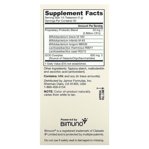 Для детей в возрасте от 3 месяцев до 4 лет смешивайте 1/4 чайной ложки в день с водой, соком, теплой детской смесью или едой или согласно рекомендациям квалифицированного медицинского работника. Не давайте порошок непосредственно младенцам или детям.Для новорожденных используйте комплексы Jarro-Dophilus® Infant с бактериями инфантис (B. infantis) M-63, наиболее важным штаммом для новорожденных.