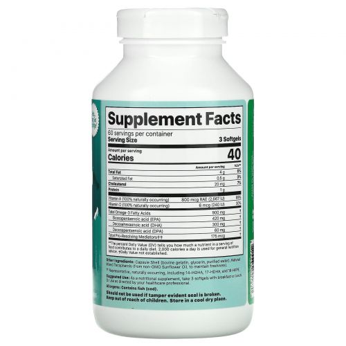 | ** Процент дневной нормы (DV) показывает, сколько питательных веществ в порции пищи способствует ежедневному рациону. 2000 калорий в день используются для общих рекомендаций по питанию. †Суточная доза не определена. †† Типичный, встречающийся в природе, включая 14-HDHA, 17-HDHA и 18-HEPE. | ||