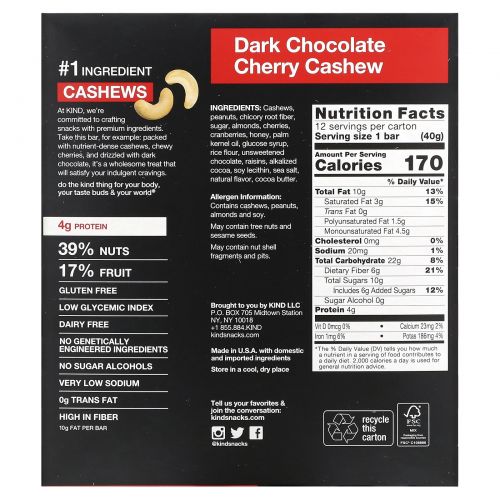 Описание товара KIND Bars, Kind Plus Dark Chocolate Cherry Cashew + Antioxidants, 12 bars 1.4oz (40g) each