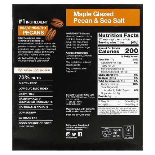 Описание товара KIND Bars, Nuts & Spices, Maple Glazed Pecan & Sea Salt, 12 Bars
