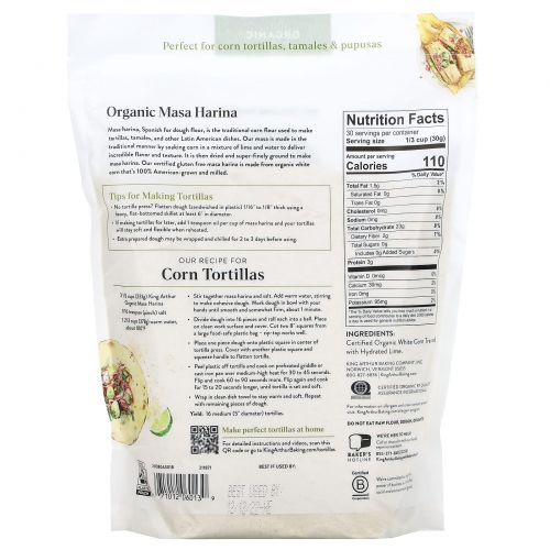 Описание товара King Arthur Flour, Органическая маса-харина из белой кукурузы мелкого помола, 907 г (2 фунта)
