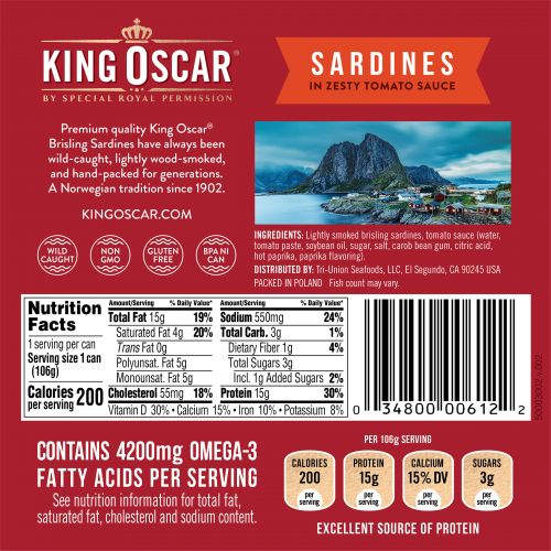 Описание товара King Oscar, Дикие сардины, в пикантном томатном соусе, 106 г (3,75 унции)