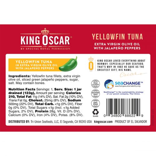 King Oscar, Желтоперый тунец, оливковое масло холодного отжима, перец халапеньо, 190 г (6,7 унции)