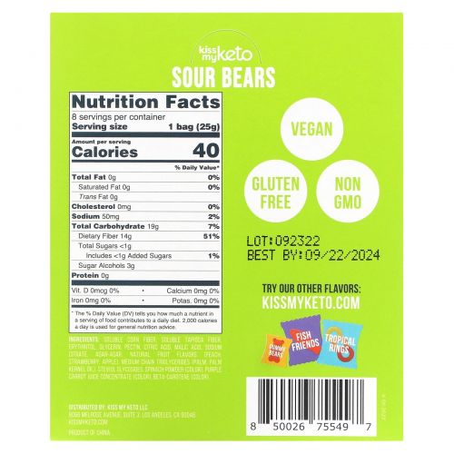 Описание товара Kiss My Keto, Gummy Candy, кислые мишки, 8 пакетиков, 25 г (0,88 унции)