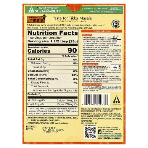 Описание товара Kitchens of India, Паста для тикка-масалы, концентрат для соусов, средний, 3,5 унц. (100 г)