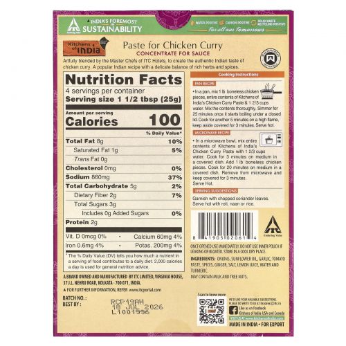 Описание товара Kitchens of India, Смесь для курицы карри, концентрат для приготовления соуса, средняя, 3,5 унц. (100 г)