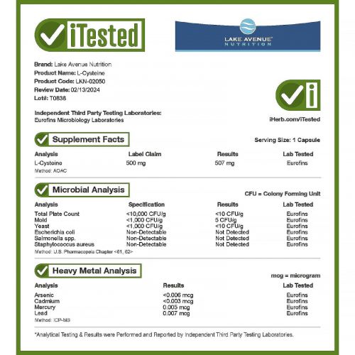 Описание товара Lake Avenue Nutrition, L-цистеин, 500 мг, 90 растительных капсул