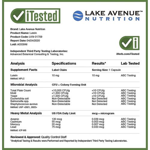 Описание товара Lake Avenue Nutrition, Lutein, 10 mg, 60 Veggie Capsules
