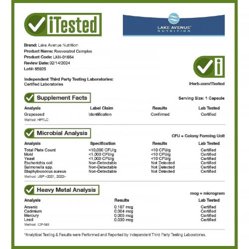 Описание товара Lake Avenue Nutrition, Комплекс с ресвератролом, 500 мг, 60 капсул