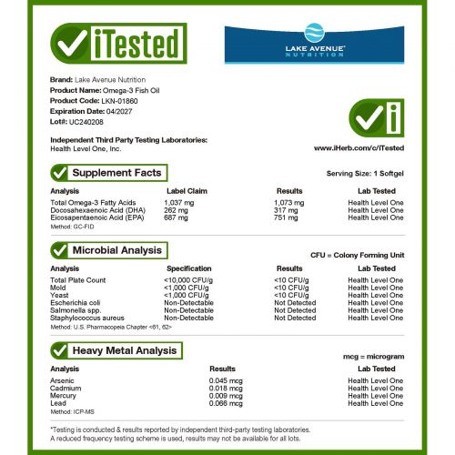 Рыбий жир с омега-3 от Lake Avenue® Nutrition содержит две жирные кислоты омега-3, ЭПК и ДГК, которые являются полиненасыщенными жирами, также известными как полезные жиры. Важно включать в свой рацион достаточное количество полезных жиров, так как они могут поддерживать здоровье сердечно-сосудистой системы*. Эти полезные жиры естественным образом содержатся во многих видах морепродуктов, а добавка с рыбьим жиром делает их удобными для получения рекомендуемой дозы.