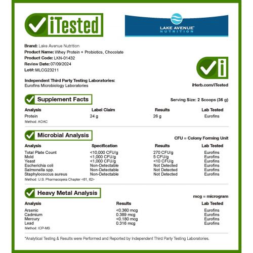 Описание товара Lake Avenue Nutrition, Whey Protein + Probiotics, Chocolate Flavor, 5 lb (2270 g)