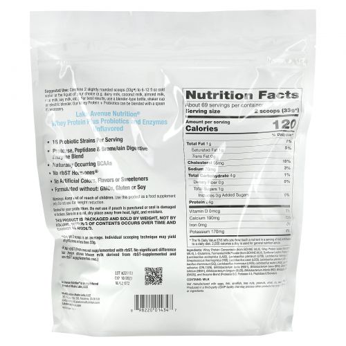 Описание товара Lake Avenue Nutrition, Whey Protein + Probiotics, Unflavored, 5 lb (2270 g)