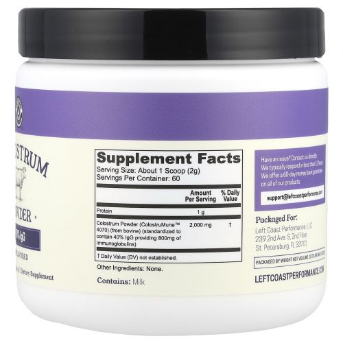 Описание товара Left Coast Performance, молозиво, порошок, без добавок, 120 г (4,23 унции)
