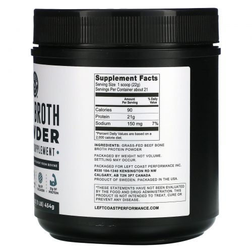 Описание товара Left Coast Performance, Порошок из костного бульона, говядина, 454 г (1 фунт)