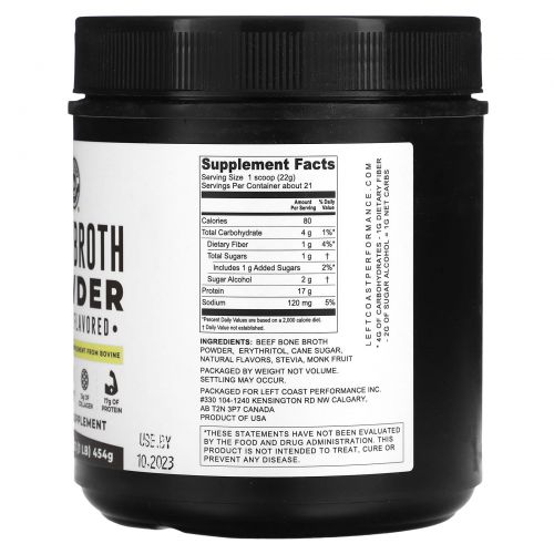 Описание товара Left Coast Performance, Порошок из костного бульона, ваниль, 454 г (1 фунт)