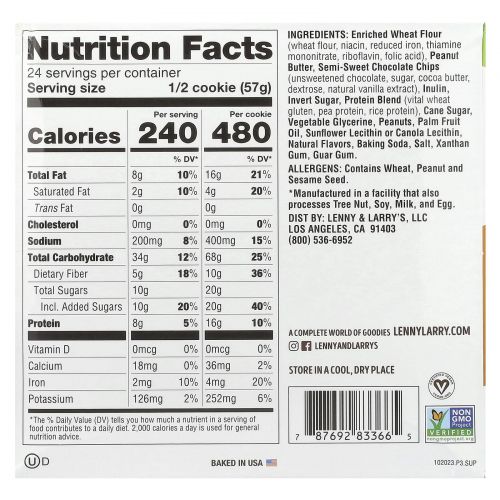Описание товара Lenny & Larry's, Цельное печенье, шоколадная стружка с арахисовым маслом, 12 печений, по 4 унции (113 г) каждое