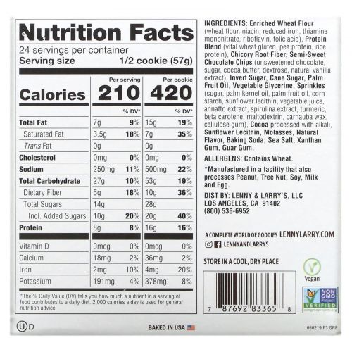 Обогащенная пшеничная мука (пшеничная мука, ниацин, восстановленное железо, мононитрат тиамина, рибофлавин, фолиевая кислота), смесь протеинов (натуральный пшеничный глютен, гороховый протеин, рисовый протеин), клетчатка корня цикория, кусочки десертного шоколада (горький шоколад, сахара, какао-масло, декстроза, натуральная ваниль), инвертированный сахар, тростниковый сахар, пальмовое масло, растительный глицерин, вкрапления (сахар, масло пальмового ядра и пальмовое масло, кукурузный крахмал, подсолнечный лецитин, овощной сок, экстракт аннато, экстракт спирулины, куркума, бета-каротин, мальтодекстрин, карнаубский воск (copernicia cerifera), целлюлозная камедь), какао-порошок (обработанный щелочью), подсолнечный лецитин, патока, натуральный ароматизатор, пищевая сода, морская соль, ксантановая камедь, гуаровая камедь.