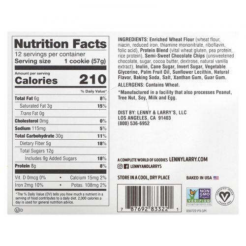 Описание товара Lenny & Larry's, The Complete Cookie, печенье с кусочками шоколада, 12 штук по 57 г (2 oz)