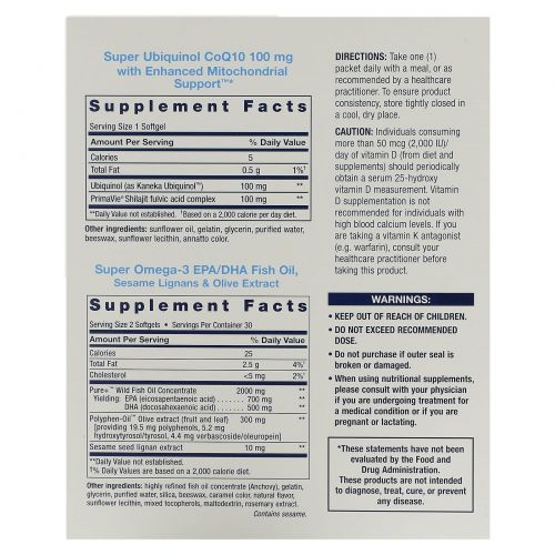 Каждый пакетик с усовершенствованным комплексом питательных веществ содержит 2 капсулы для приема два раза в день, 2 мягкие таблетки Super омега-3 ЭПК и ДГК, 1 мягкую таблетку препарата Health Booster для приема 1 раз в день, 1 мягкую таблетку убихинола Super Ubiquinol с коэнзимом Q10 и Enhanced Mitochondrial Support™ (100 мг) и 1 капсулу экстракта куркумы Super Bio-Curcumin®, обеспечивая питательные вещества, необходимые для здоровья и долголетия, в удобной одноразовой упаковке.