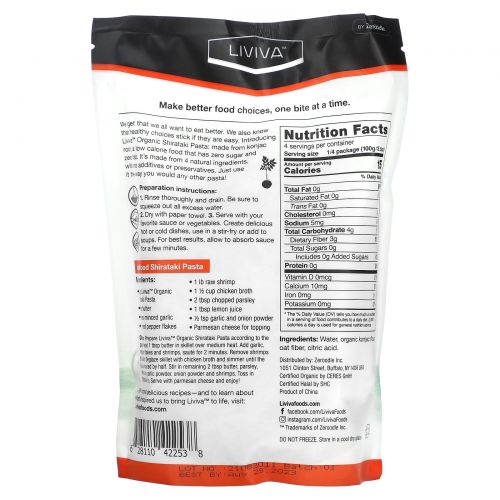 Мы понимаем, что все хотим есть лучше. Мы также знаем, что здоровый выбор остается неизменным, если это легко. Представляем органическую пасту ширатаки Liviva ™: изготовленную из корня конжака, низкокалорийного продукта без сахара и жира. Он изготовлен из 4 натуральных ингредиентов, без добавок и консервантов. Используйте ее так же, как любую другую пасту!
