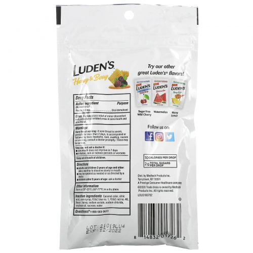 Описание товара Luden's, Леденцы с пектином, успокаивающее средство для полости рта, с медом и ягодами, 25 леденцов для горла