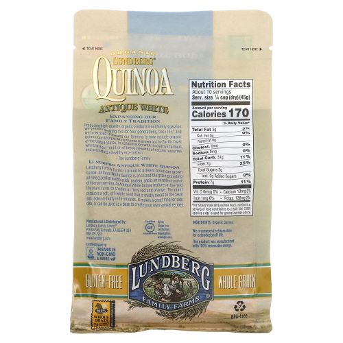 Семейные фермы Lundberg с гордостью представляют выращенную в Америке киноа. Античная белая киноа - это невероятное зерно, которое содержит все девять незаменимых аминокислот, белок и является отличным источником клетчатки в одной порции. По мере созревания античной белой киноа в поле цвет растения приобретает ярко-красный и оранжевый цвета. Растение дает мягкие, не совсем белые семена, слегка сладкие на вкус и готовящиеся к пышной форме за 15 минут. Из него можно приготовить отличное блюдо или гарнир, а также использовать его в качестве основы для создания собственных рецептов.
