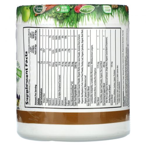 | Суперпродуктовая овощная смесь Порошок из органического шоколада (какао), порошок сока из органического ячменя, экстракт вишни ацеролы, органические плоды красной малины, порошок из корня моркови, лист петрушки, органическая спирулина, органическая корень свеклы, листья органического шпината, листья кресс-салата | 3266 мг | † | † |