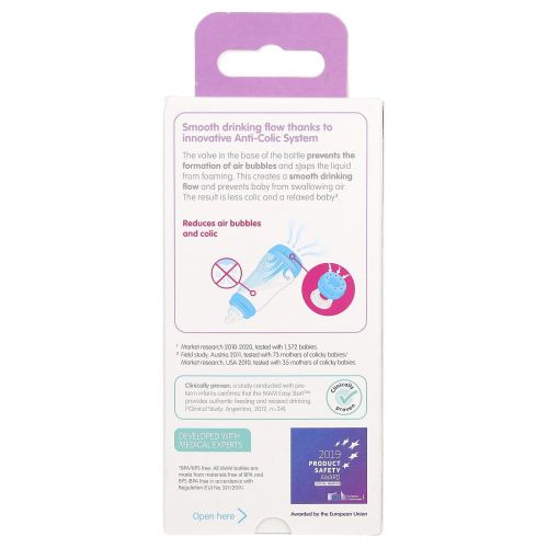 Антиколиковое средство: Уменьшает количество воздуха и колики. Поддерживает индивидуальный рацион ребенка. Мягкий поток питья. Меньше колик подтверждено 80% матерей2.