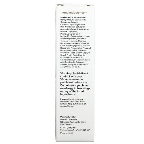 Другие ИнгредиентыВода (вода), мед (мел), полиакриламид, циклопентасилоксан, каприловый / каприновый триглицерид, масло из рисовых отрубей (Oryza sativa), акрилоилдиметилтаурат аммония / ВП сополимер, феноксиэтанол, изопарафин с13-14, бутиленгликоль, олеиловые эфиры масла ши, ламинат 7, токоферилацетат, стеароксидиметикон, глицерин, динатрий ЭДТА, этилгексилглицерин, глюкозил гесперидин, аминометил пропанол, диметикон, экстракт семян проса (Panicum miliaceum), каприлил гликоль, экстракт опунции (Opuntia ficus-indica) , пчелиный яд, лимонная кислота, дубильная кислота, сорбат калия, ацетил гексапептид-37, ацетилоктапептид-3.