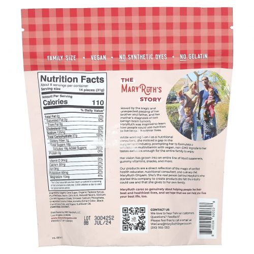 Описание товара MaryRuth's, жевательные снеки в виде мишек с электролитами и клетчаткой, клубника, апельсин и папайя, 240 г