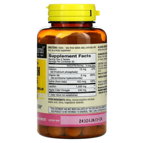 Описание товара Mason Natural, Lecithin with Kelp/B6 Plus Cider Vinegar Extra Strength, 100 Tablets