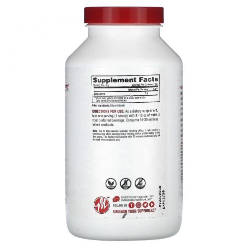 Metabolic Nutrition содержит 3000 мг чистейшей формы бета-аланина фармацевтической степени чистоты, специально разработанной для людей, которые хотят максимизировать свое здоровье и хорошее самочувствие.