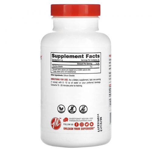 Metabolic Nutrition содержит 5000 мг чистейшей формы цитруллина малата фармацевтической степени чистоты, специально разработанную для людей, которые хотят максимизировать свое здоровье и хорошее самочувствие.