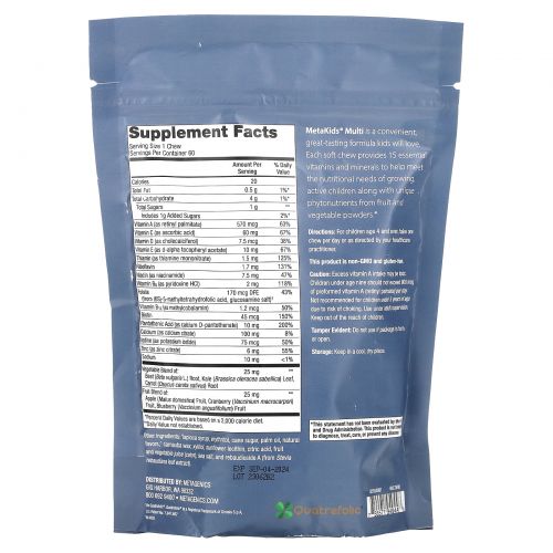 MetaKids® Multi - это удобная формула с отличным вкусом, которая понравится детям. Каждая жевательная таблетка содержит 15 незаменимых витаминов и минералов для удовлетворения потребностей растущих активных детей в питании, а также уникальные фитонутриенты из фруктовых и овощных порошков.