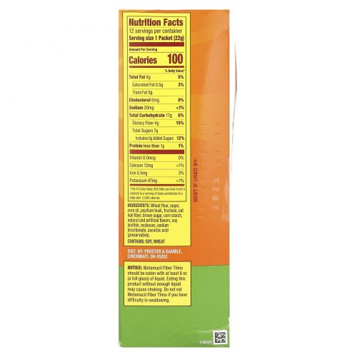 Примечание. Metamucil Fiber Thins следует запивать не менее 240 мл (8 унциями) или полным стаканом жидкости. Употребление этого продукта без достаточного количества жидкости может вызвать удушье. Не принимайте клетчатку Metamucil, если вы испытываете трудности с глотанием.