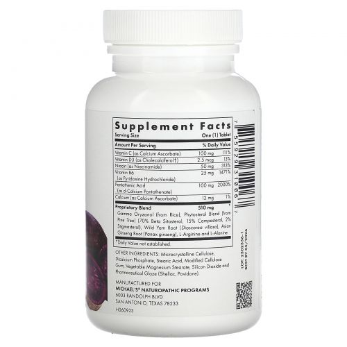 | Запатентованная смесь гамма оризанол (из риса), смесь фитостеролов (из сосны) (70% бета-ситостерола, 15% кампестерина, 2% стигмастерола), корень дикого ямса (Dioscorea villosa), корень женьшеня азиатского (Panax ginseng), L-аргинин и L-аргинин аланин-гамма-оризанол (из риса), смесь фитостеролов (из сосны) (70% бета-ситостерола, 15% кампестерина, 2% стигмастерола), корень дикого ямса (Dioscorea villosa), корень азиатского женьшеня (Panax ginseng), L-аргинин L-аланин | 510 мг | * |