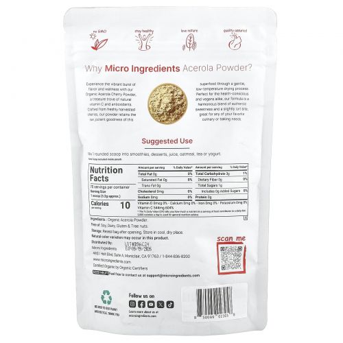 Описание товара Micro Ingredients, Органическая ацерола в порошке, 227 г (8 унций)