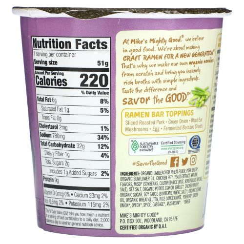 Описание товара Mike's Mighty Good, Craft Ramen Cup, Pork Tonkotsu Ramen Soup, 1.7 oz (51 g)