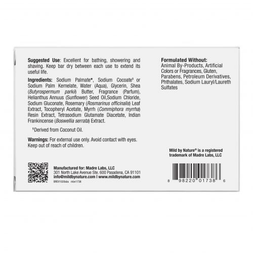 Описание товара Mild By Nature, кусковое мыло с сырым маслом ши, с витамином E, розмарином, миррой и ладаном, 141 г (5 унций)