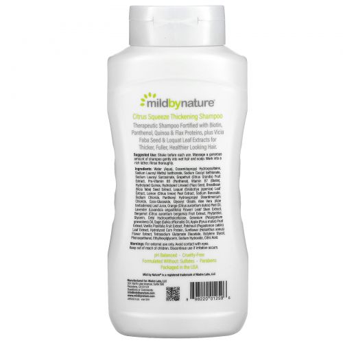 Описание товара Mild By Nature, Загущающий шампунь с комплексом витаминов группы B и биотином, без сульфатов, цитрусовый, 473 мл (16 жидк. Унций)