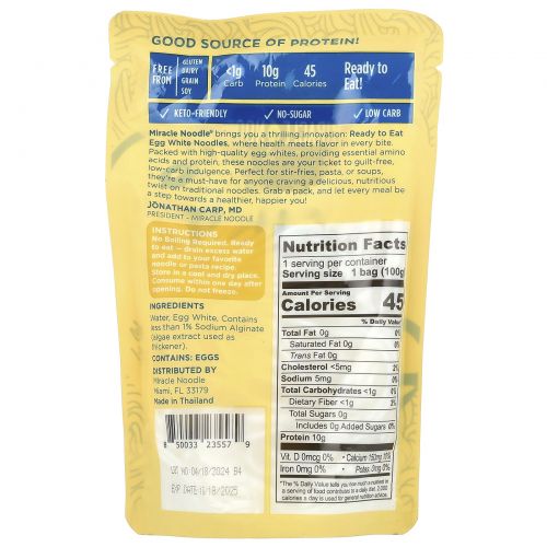 Miracle Noodle® представляет собой захватывающую инновацию: Готовая к употреблению лапша из яичного белка, где здоровье сочетается со вкусом в каждом кусочке. Эта лапша, содержащая высококачественный яичный белок, а также незаменимые аминокислоты и белок, - ваш пропуск к низкоуглеводному удовольствию. Они идеально подходят для жарки, пасты или супов, а также для тех, кто любит вкусную и питательную традиционную лапшу. Возьмите упаковку, и пусть каждый прием пищи будет шагом на пути к более здоровому и счастливому вам!