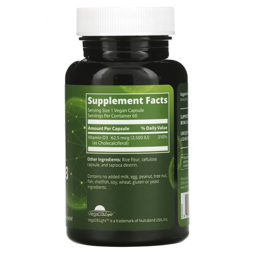 | Витамин D3 растительного происхождения (в виде холекальциферола) | 62,5 мкг (2500 МЕ) | 313% |