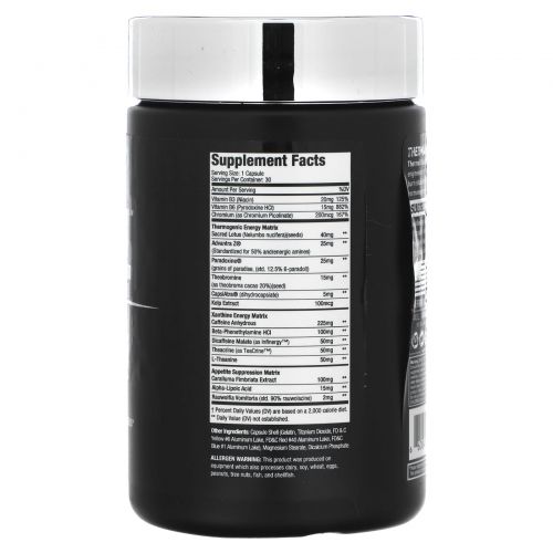 ПредупрежденияНе принимать в период беременности и кормления грудью, а также лицам моложе 18 лет. Проконсультируйтесь с врачом перед приемом этой или любой другой пищевой добавки, особенно если вы страдаете или подозреваете, что страдаете каким-либо заболеванием, принимаете ЛЮБЫЕ лекарства, безрецептурные продукты или другие пищевые добавки. Немедленно прекратите использование и обратитесь к врачу, если у вас возникнут какие-либо побочные реакции на этот продукт. Следуйте инструкциям на этикетке и не превышайте рекомендуемую порцию. Не следует использовать продукт, если защитная пленка повреждена или отсутствует. Хранить в недоступном для детей месте. Хранить в сухом и прохладном месте.