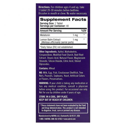 Описание товара Natrol, Kids, мелатонин, для детей от 4 лет, клубничный вкус, 40 таблеток