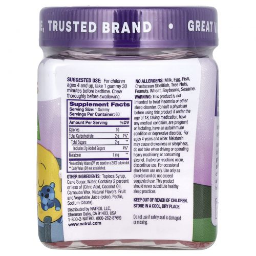 Успокойте своего ребенка и приготовьте его ко сну с помощью жевательных таблеток с мелатонином от Natrol®. Мы знаем, как это тяжело, когда у детей случаются бессонные ночи, но вы можете быть уверены, что Natrol® поможет вашему ребенку высыпаться†. Продукт содержит 1 мг мелатонина мягкого действия, который помогает быстрее заснуть и дольше спать†. Наши предприятия Natrol® успешно прошли аудит на соответствие требованиям надлежащей производственной практики (GMP) NSF/ANSI 455-2 для пищевых добавок, являющийся одним из самых строгих аудитов, доступных в США в категории «Производство пищевых добавок». Natrol® стремится создавать инновационные качественные продукты, которые помогут вам поддерживать свое здоровье и преуспевать в современном напряженном ритме жизни.