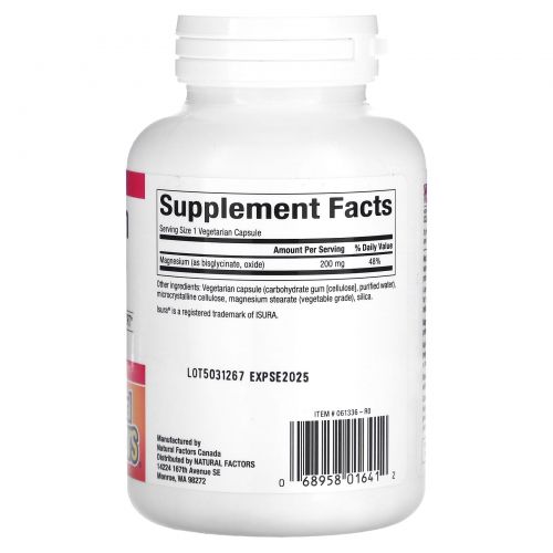 Natural Factors, Бисглицинат магния, 200 мг, 120 вегетарианских капсул